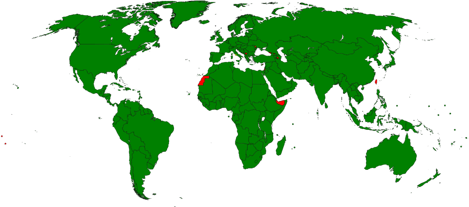 該地圖為2012年世界主權國家地圖。其中綠色部分為加入聯合國的主权国家,梵蒂岡被单独以黃色标识,而紅色部分为有争议的未被普遍承认的国家(圖中阿爾察赫共和國已不存在)