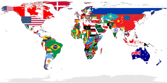 2026年世界国旗地图,其中每个国家或地区的辖域都以其旗帜覆盖(實際控制領域,部分爭議區域未標註;南極洲因南極條約凍結目前領土所有權的主張,此圖中南極洲所用旗幟由埃文·湯森設計)