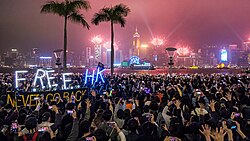 部分市民參加2019年除夕倒數活動時舉起五指手勢