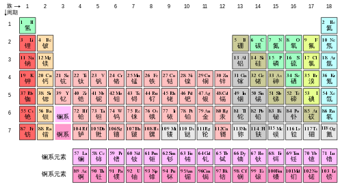| 碱金属 碱土金属 镧系元素 錒系元素 过渡金属 | 貧金屬 类金属 多原子非金屬 非金属元素 稀有气体 |
