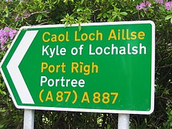蘇格蘭一個雙語路牌,黃字為蘇格蘭蓋爾語,白字為英語