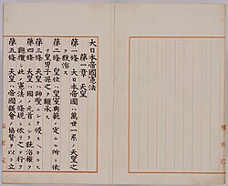 《大日本帝國憲法》(日語:大日本帝国憲法〔大日本帝󠄁國憲󠄁法〕/だいにっぽんていこくけんぽう,羅馬化:dai nippon teikoku kenpō)是日本首部憲法,公布於明治22年(1889年)2月11日,並於明治23年(1890年)11月29日施行,至二戰後的1947年被現行的《日本国宪法》取代。在很多情況下,该部宪法也被称作“帝國憲法”、“明治憲法”,相对於现行宪法,也被称作“旧宪法”。《大日本帝國憲法》是日本首部依近現代君主立憲體系制定的憲制性文件,所有條文在施行期間均未曾修改。其特色為採用二元制君主立憲制,天皇的政治地位高於三權分立的各國家機關,在日本具有至高無上的地位,雖然如此但實務上也保障了國會的功能,內閣的決策也會得到充分重視甚至取代,而兩者權力存在此消彼漲的爭議,是近代史研究中比較被淡化的討論點。值得注意的是,尽管这部宪法名称带有「大日本帝国」字樣,但此詞在当时并非日本正式国号,一直到昭和11年(1936年),日本国号才正式统一称为「大日本帝国」。