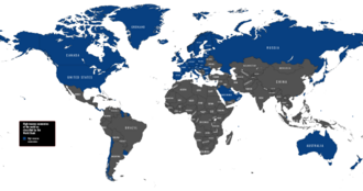 ![]() 圖中藍色部分代表已開發國家或地區,紅色代表最低度開發國家,橙色代表其餘的開發中國家。(來自國際貨幣基金組織與聯合國之分類) | |