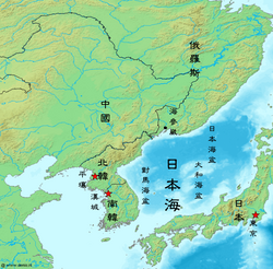 • 南北朝期間,朝鮮半島上的民族稱朝鮮半島東側沿海為東海,该沿海并非日本海。(韓語:동해 Donghae/東海)。