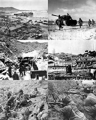 ![]() 由左至右,由上至下為:联合国军在仁川登陆;长津湖战役中撤退的美国海军陆战队;原州戰役的美國第2步兵師;雙隧道之戰的法國營坦克;砥平里戰役的美軍士兵;上甘岭战役的中國人民志願軍士兵。 | |||||||||