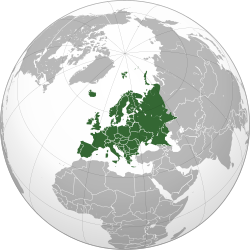图例:蓝 = 洲际国家;绿 = 有时会被认为是欧洲,但在欧洲边界线之外。