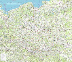 波蘭的地形概覽圖,包含所有城市、部分村莊及主要基礎設施(例如機場)