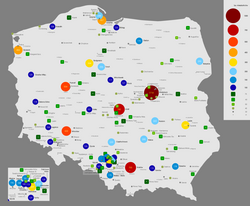 人口超過20,000的波蘭城市分布圖(截至 2010年1月1日)