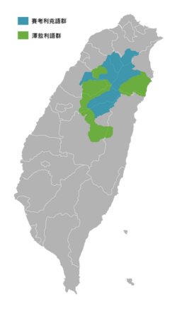 - 賽考利克泰雅語(Squliq Atayal):分布最廣,區域廣達新北市烏來區、以桃園市復興區為主的北橫山區、新竹縣尖石鄉山區、臺中市和平區、南投縣仁愛鄉部分地區等。
