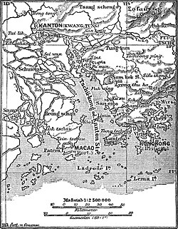1890年珠三角的德語地圖,標有廣州市、葡屬澳門、英屬香港