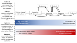• 如果疾病爆发导致了流行病疫情,则按照流行规模,可以分为小规模的“地方性流行”(英語:Endemic),或大规模的“地区性流行”(英語:Epidemic),或全球性的“瘟疫/大流行”(英語:Pandemic)。