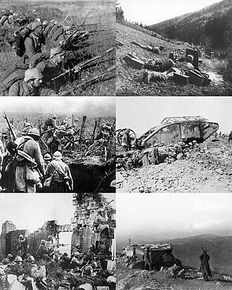![]() 左上:第一次馬恩河戰役中的德國士兵;右上:戈爾利采—塔爾努夫攻勢中的奧匈士兵;左中:凡爾登戰役中的法國士兵;右中:索姆河戰役中的Mark I 坦克;左下:第二次馬恩河戰役中的法國機槍手;右下:瓦爾達爾攻勢所在地的保加利亞電信站 | |||||||