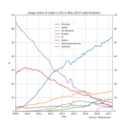 1993年,馬克·安德森釋出Mosaic——「世界上最流行的瀏覽器」,進一步推動了瀏覽器的創新,這使得全球資訊網更易於使用。安德森的瀏覽器引發了1990年代的網際網路熱潮。安德森是NCSA中Mosaic團隊的領導者,他不久後辭職並成立了自己的公司——Netscape,釋出了受Mosaic影響的Netscape Navigator。Netscape Navigator很快便成為世界上最流行的瀏覽器,市佔率一度達到90%。 作為應對,錯失了網際網路浪潮的微軟匆促購入了Spyglass公司的技術,釋出Internet Explorer。這引發了第一輪瀏覽器大戰。因捆綁於Windows,Internet Explorer於網頁瀏覽器市場取得了主導地位,其市佔率於2002年達到最高時超過95%。