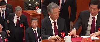 此后,根据前述媒体来源,以及《海峡时报》、法新社、美联社、路透社、盖帝图像等其他媒体记者拍摄的现场画面,一位戴着口罩的不明身份人员也赶来。在习近平指着文件对不明身份人员交代约20秒之后,此人试图将胡锦涛带走。胡显示出抗拒。不明身份人员先是双手伸到胡腋下,企图抱起未果,胡反而伸手去拿习近平桌面上的文件,被习近平亲手压住,在不明身份人员转而与胡锦涛耳语并数次尝试之后,胡锦涛才起身,但仍未立刻离开,而且多次试图坐下。此时,栗战书已将胡锦涛的文件放在选票夹下从后方交给不明身份人员,胡锦涛伸手去取此人手中自己的文件,未果。最后,胡锦涛终于离场,并在临走经过习近平时,俯身向习近平短暂交代,又拍了拍坐在习近平右手位的李克强的肩膀,然后在不明身份人员和孔绍逊随护中离场。约半小时后,孔绍逊回到习近平身边并在短暂交谈后离去。彭博新闻社、《华尔街日报》及《纽约时报》等媒体根据现场照片和视频对事件经过进行了详细描述。