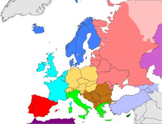 CIA在《世界概况》一書中所定義的歐洲分區,淺藍色為西歐。