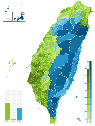 高雄市 2,299,558 55,309 3.14% 610,896 34.63% 1,097,621 62.23% 17,006 77.44% 486,725