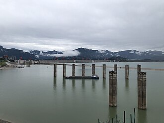 前景为土坝南部,主坝景观。后面的墙将溢洪道和水轮机水流与船闸和升船机上游引航道分开。在下游侧使用了类似的分离,部分见上图。